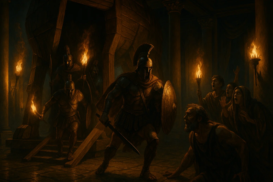 말 속에서 그리스 병사들이 쏟아져 나왔고,